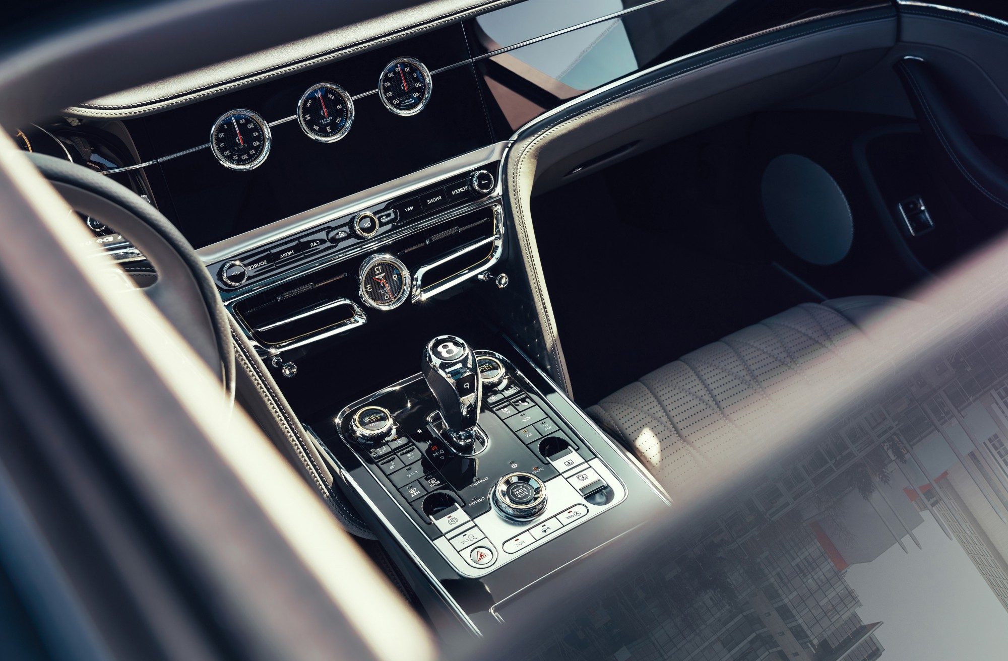 Обертаючий 3D-дисплей Bentley також доступний в новому Flying Spur V8. При натисканні кнопки запуску двигуна відкривається 12,3-дюймовий сенсорний екран, що відображає три цифрові вкладки, що налаштовуються індивідуально. Друга сторона дисплея показує три елегантних аналогових циферблата, що відображують зовнішню температуру, компас і хронометр.
